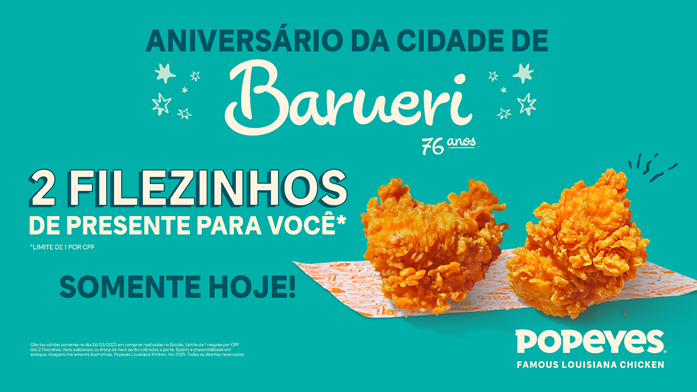 Para comemorar os 76 anos de Barueri, cidade localizada na região metropolitana de São Paulo, Popeyes® preparou uma oferta especial para os apaixonados por frango frito: no dia 26 de março, os clientes que visitarem os restaurantes de Popeyes® na região poderão garantir dois Filezinhos grátis, além de aproveitar promoções exclusivas para celebrar a data com muito sabor.